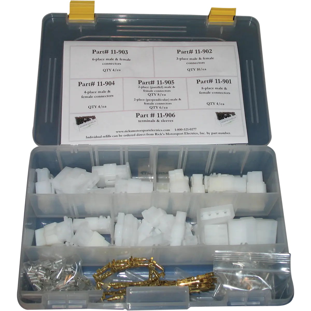 • Il kit include (8) connettori maschio/femmina a 6 posizioni, (4) connettori maschio/femmina a 4 posizioni, (8) connettori maschio/femmina (paralleli) a 2 posizioni, (6) connettori maschio/femmina (perpendicolari) a 2 posizioni, (4) connettori maschio/femmina a 8 posizioni, (10) connettori maschio/femmina a 3 posizioni, (25) boccole in plastica, (25) connettori a perno femmina, (25) connettori a perno maschi, (50) terminali a morsetto maschio, (50) terminali a morsetto femmina
