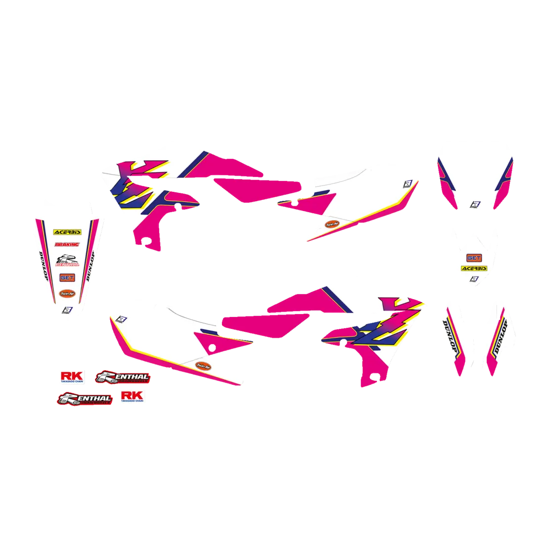• The sticker kit includes: radiator shrouds pair, airbox pair, fork protections pair, swing arm pair, front fender, rear fender and Motocross and Enduro plates