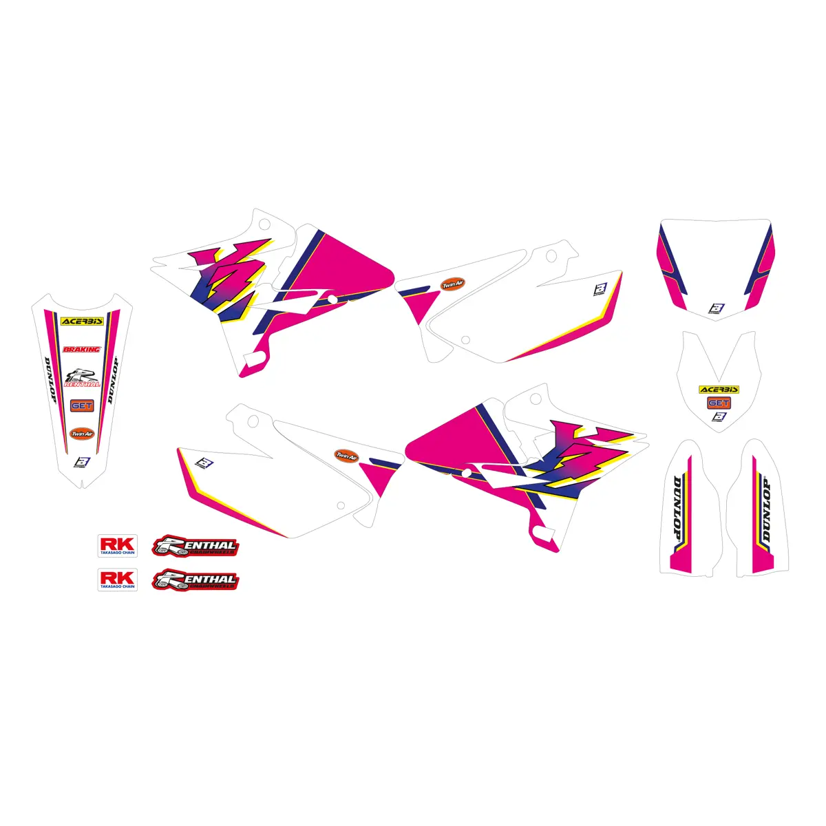 • The sticker kit includes: radiator shrouds pair, airbox pair, fork protections pair, swing arm pair, front fender, rear fender, seat cover and Motocross and Enduro plates
